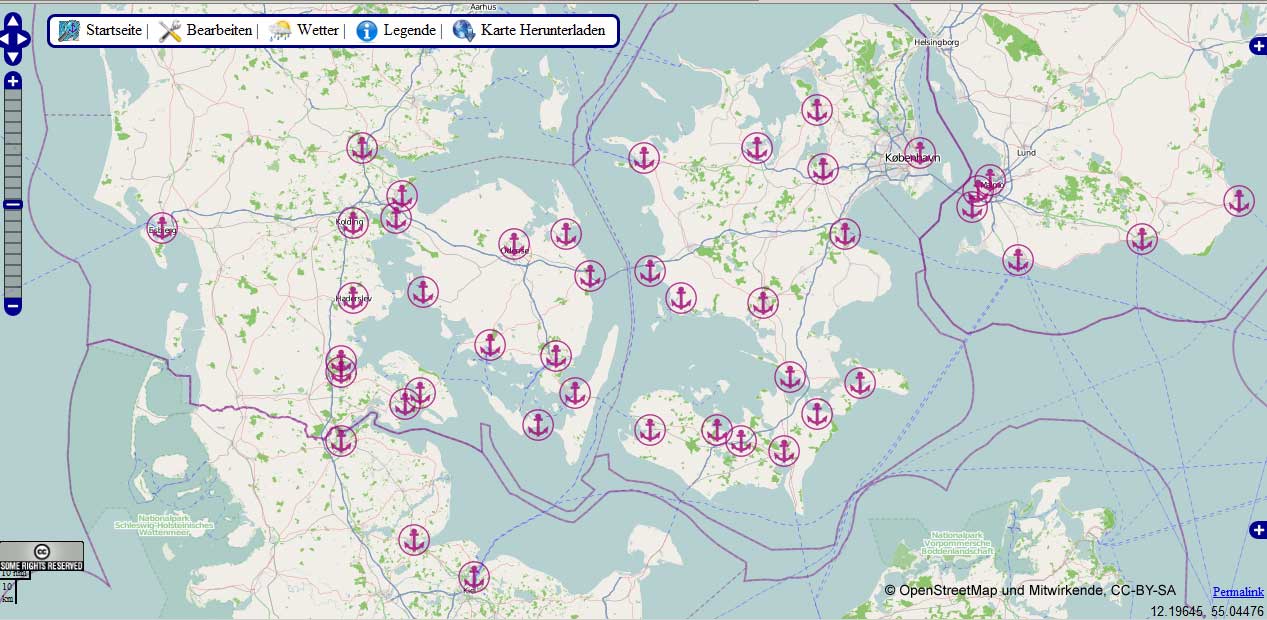 Fig. 2 ¹: Seekarte mit Häfen und Hafen-anlagen, Leuchttürmen, Seezeichen, Schifffahrtslinien: www.OpenSeaMap.org